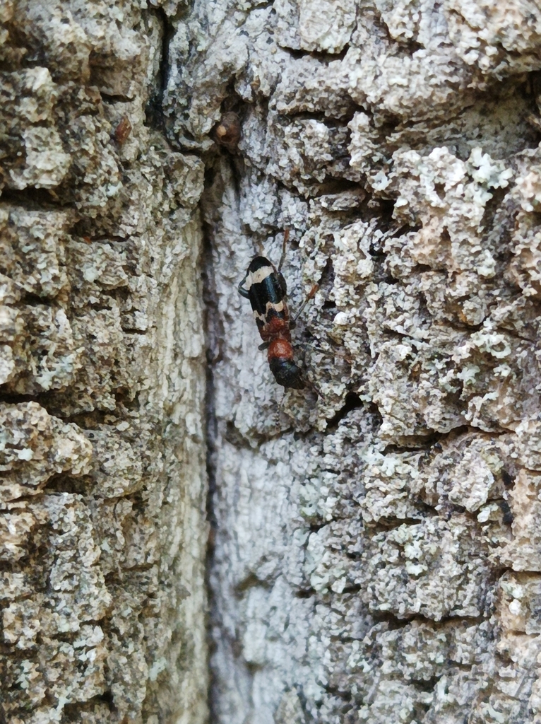 Обнаружил я его чисто случайно - выгуливал детеныша на детской площадке и как водится - скучал. Походу даже начал выискивать, что бы забить в iNaturalist (там как раз затишье перед очередным челенджем). По стволу ближайшего тополя как раз бегали туда-сюда черные муравьишки. И вдруг в их ряды затесался один пестренький.