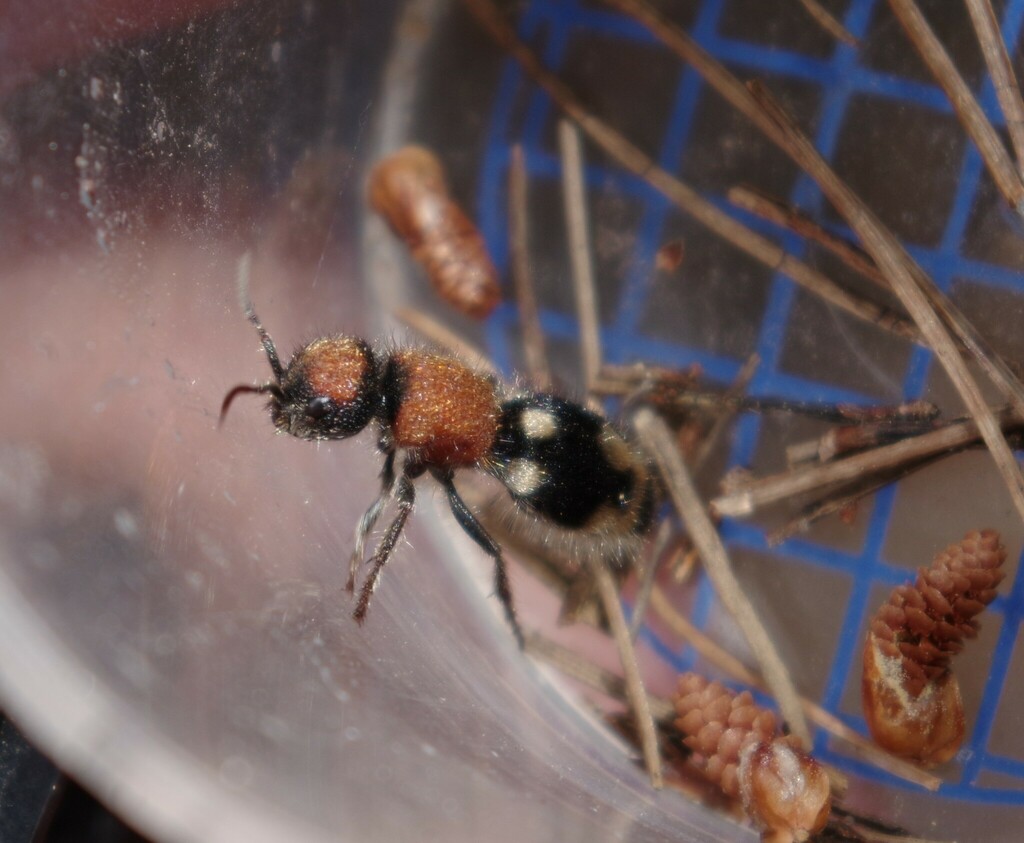 И оказалось, что никакой это не муравей, а вовсе даже пчела! Или оса, тут изобретатели тривиальных имен договориться не смогли. Называется Ronisia brutia и относится к муравьепчелам (это если по-немецки - Bienenameisen), они же - "бархатные муравьи" или Осы-немки. Немки - это вероятно потому, что немые - не жужжат. Нечем им жужжать - у самок Ронизий отсутствуют крылья и они ведут приземленный образ жизни. А вот жало, как у всех уважающих себя ос, у них очень даже имеется и ужалить они им могут весьма болезненно. Муравьепчелы - одиночки, к тому же - гнездовые паразиты по отношению к другим пчелам и осам. Ползают и ищут земляные норки своих дальних родственников, чтобы отложить туда свои яйца.