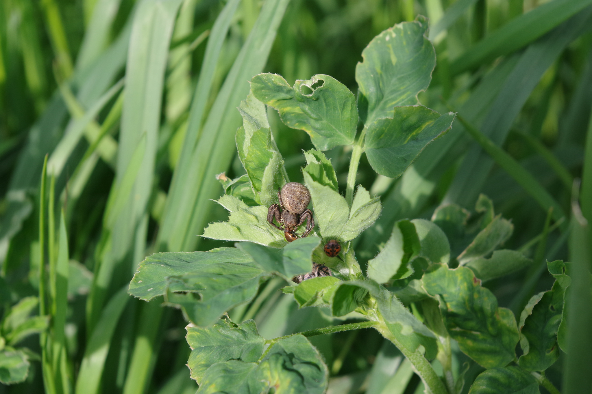 Паук из рода Xysticus (не знаю, есть ли у них русское название) поймал 24-хточечную божую коровку. Еще одна такая же коровка сидит рядом не подозревая о печальной участи соседки.